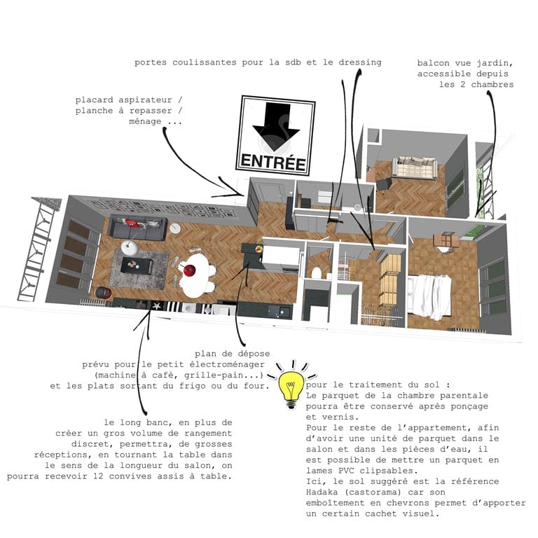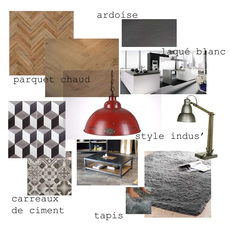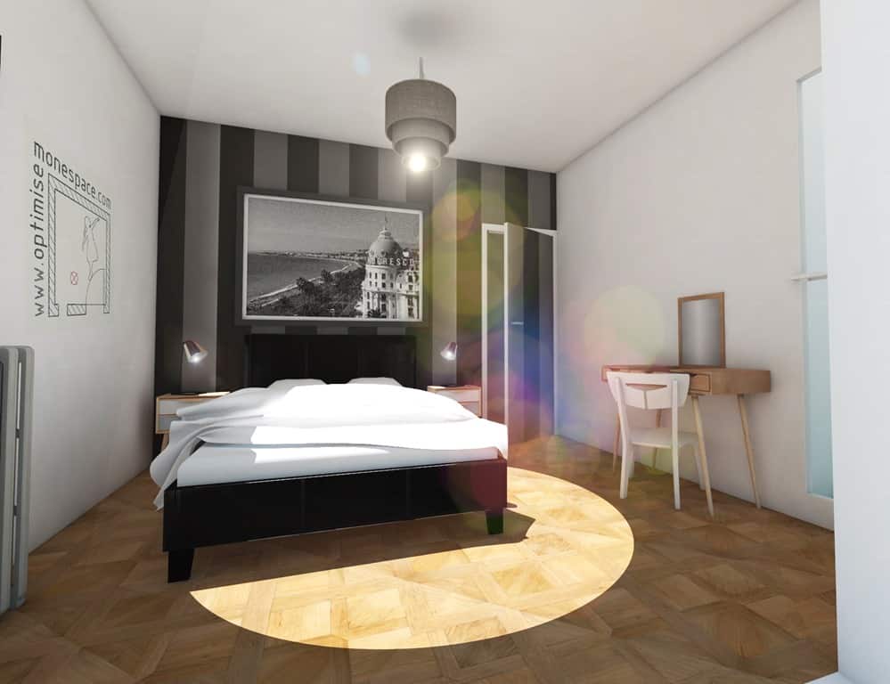 Ici, on vise un couple de trentenaires “bourgeois bohèmes” : On met donc en valeur les hauts plafond en posant un faux-parquet en point de Hongrie, rappelant les vieux immeubles, on joue sur le côté “rétro” avec des accessoires style industriel, carreau de ciment … mais on n’oublie pas d’être super contemporain (et intemporel) avec du mobilier dans les tons blanc et anthracite. Le faux-parquet sera en fait des lames de pvc clipsables, qui ont le quadruple avantage d’être esthétiquement bluffantes, d’une simplicité de mise-en oeuvre, d’une compatibilité avec les salles d’eau, et d’un coût nettement inférieur !