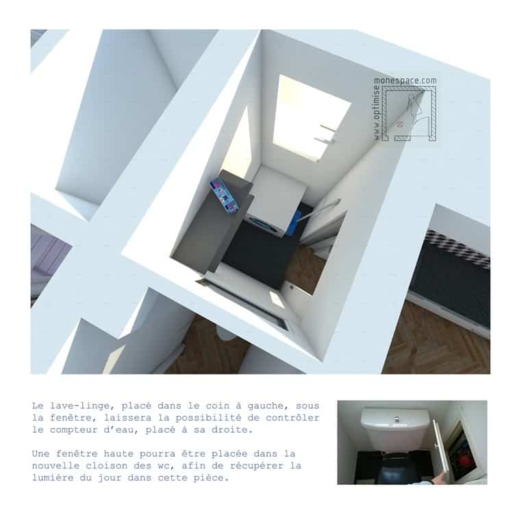 Mais ici l’objectif est la revende rapide à un prix nettement supérieur au prix d’achat. Je propose donc, en plus de l’ajout d’une chambre, la création d’un dressing indépendant afin de susciter un effet “coup de foudre” pour cet appartement idéalement situé avec 2 vues dégagées. Et afin de ne rien négliger, je tiens également à garder les toilettes indépendantes, à concevoir une cuisine spacieuse et ergonomique, et éviter de placer le lave-linge dans la cuisine.