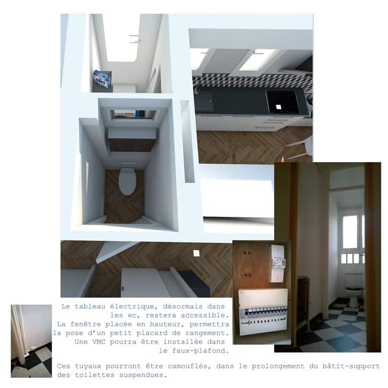 Les évacuations de la nouvelle salle d’eau rejoignent la gaine technique de l’ancienne cuisine. La douche n’est pas une douche à l’italienne au ras du sol mais un receveur surélevé d’une dizaine de centimètres, afin d’assurer une pente nécessaire de 2%. Le tuyau passe ensuite sous le bureau où il peut être caché sous le bureau dans une masquette (coffrage bas).Merci de votre commentaire :-)