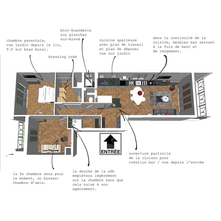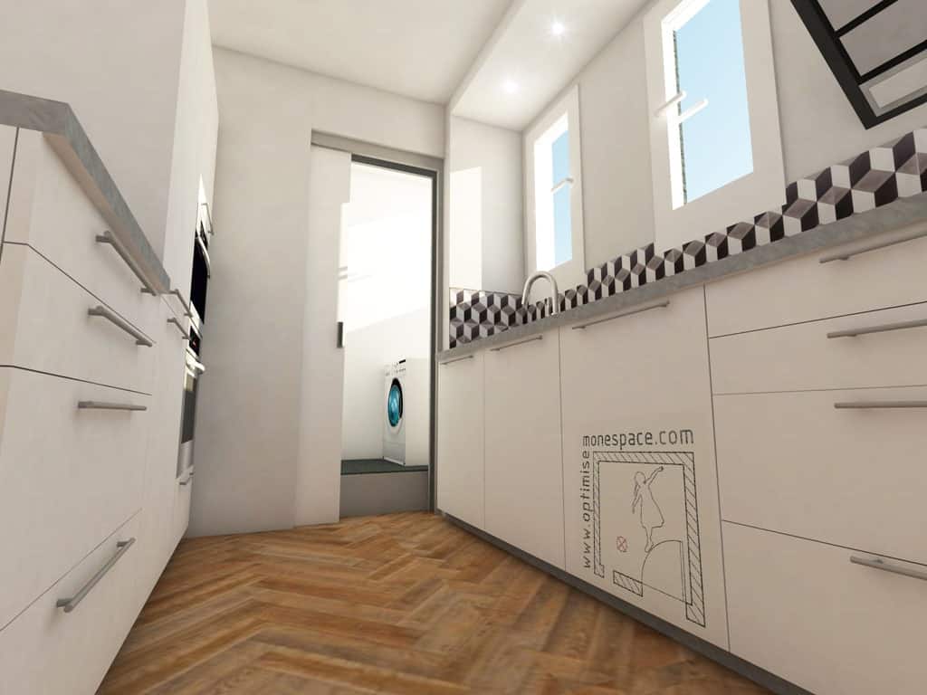 Ici, on a ouvert l’entrée sur la cuisine pour récupérer la vue jardin qui était autrefois dans la salle-de-bain.