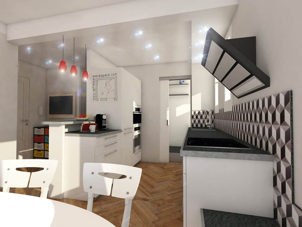 La cuisine et le salon se situant aux opposés de l’appartement, il était nécessaire de rendre l’habitation plus contemporaine en rapprochant ces 2 pièces et en les ouvrant l’une sur l’autre.