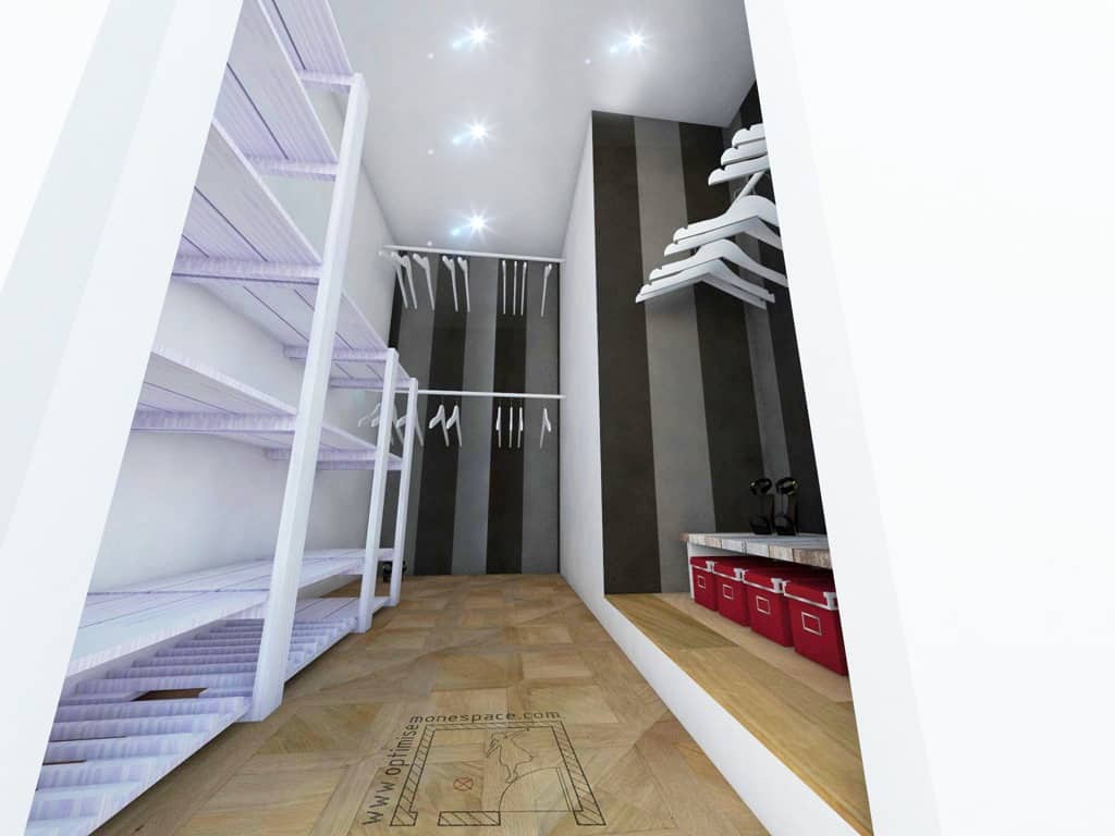 Ici, le dressing n’est pas immense, mais il sera ultra-optimisé, et surtout mis-en-valeur grâce à des spots en faux-plafond : indispensable pour créer l’effet recherché !