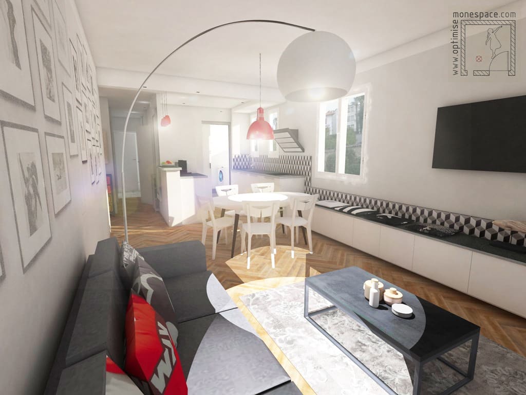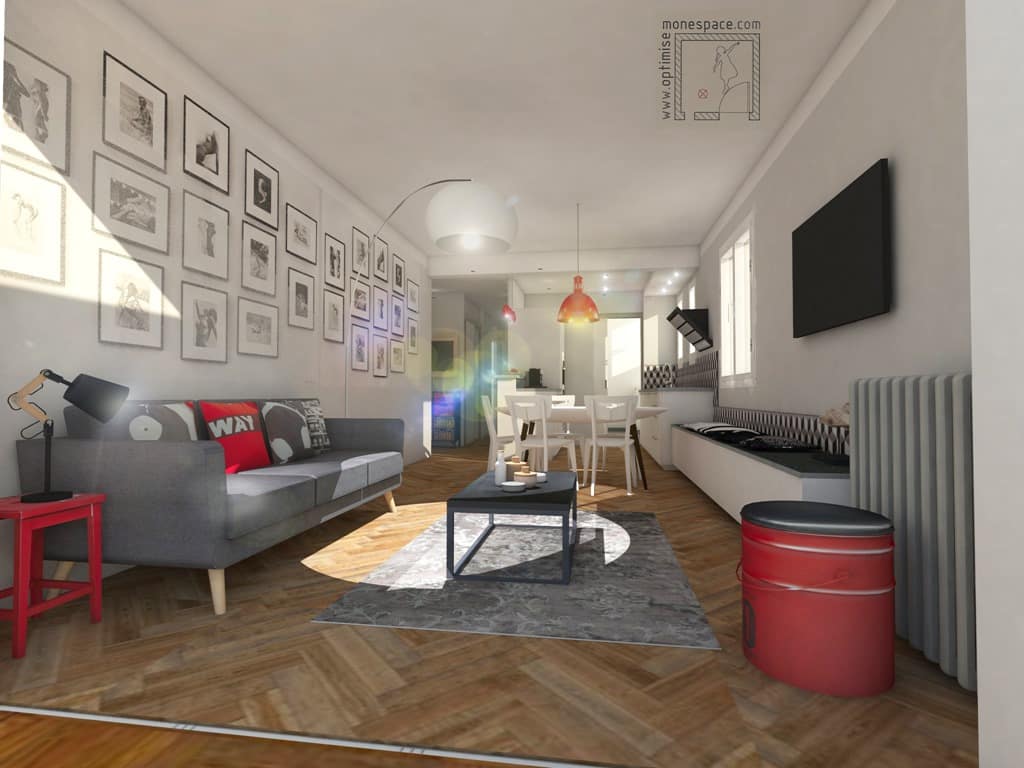 Dans un petit appartement, la plus grande crainte est de ne pas pouvoir recevoir dans le salon. Si vous voulez un appartement accueillant, ne vous contentez-pas de placer un canapé face à la télévision ! Ou vous serez condamné à discuter avec vos amis… comme sur le banc d’une station de bus ! Ici, n’ayant pas la place de placer 1 deuxième canapé ou de gros fauteuils, je propose d’inclure un pouf (le bidon rouge), peu encombrant, et surtout, une série de meuble bas dans la continuité de la cuisine, qui servira en même temps de meuble tv et de banc d’appoint.