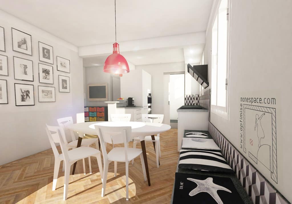 Ce banc créera en même temps un lien, de la cuisine au salon, en passant par la salle-à-manger. Et il offrira un grand rangement sans encombrer la pièce ! Il n’y aura rien d’autre à prévoir comme meuble, le futur acquéreur pourra réellement rentrer “avec ses valises” !