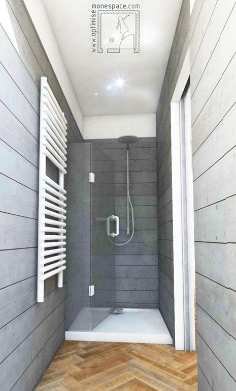 LA SDB : 2.4 m2 suffisent pour placer 1 douche 90×100 cm, un meuble-vasque de 90cm et un radiateur sèche-serviettes !