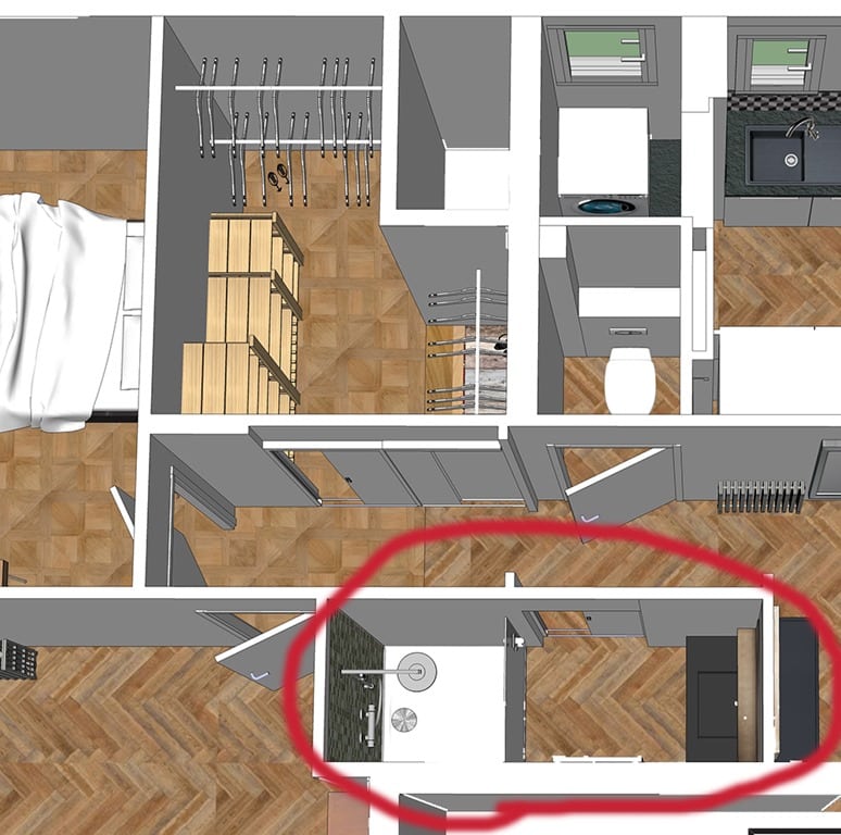 Alors ici, comble du luxe, au fond de la cuisine, on a même une mini-buanderie séparée par une porte coulissante : il s’agit en fait de l’ancien emplacement des toilettes, que l’on a avancé d’environ 1m50 : le plancher est donc suffisamment sur-élevé pour permettre le passage du tuyau d’évacuation.