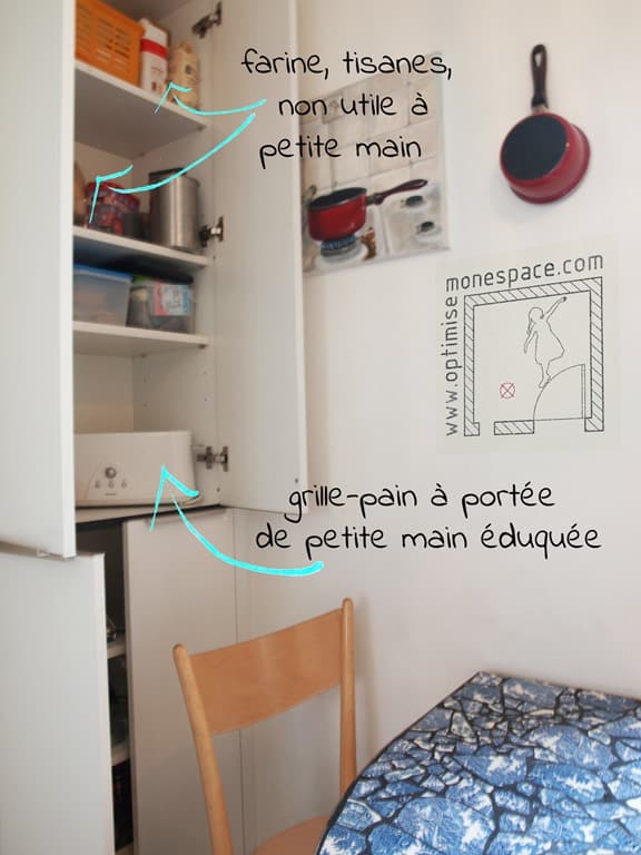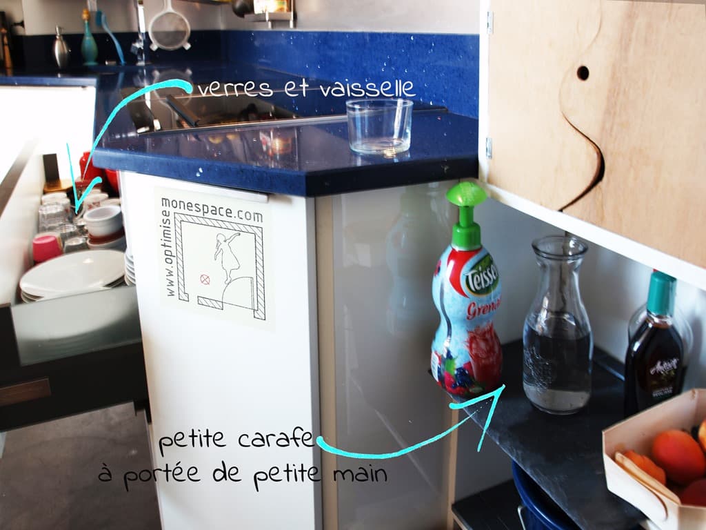 Oui, les verres peuvent se ranger dans les tiroirs du bas ! C’est juste une habitude à prendre. Tant que vous y êtes, rangez-y aussi tout ce qu’il faut pour que votre enfant puisse mettre le couvert tout seul … non n’ayez pas peur de la casse ! Comment va-t-il apprendre sinon ?