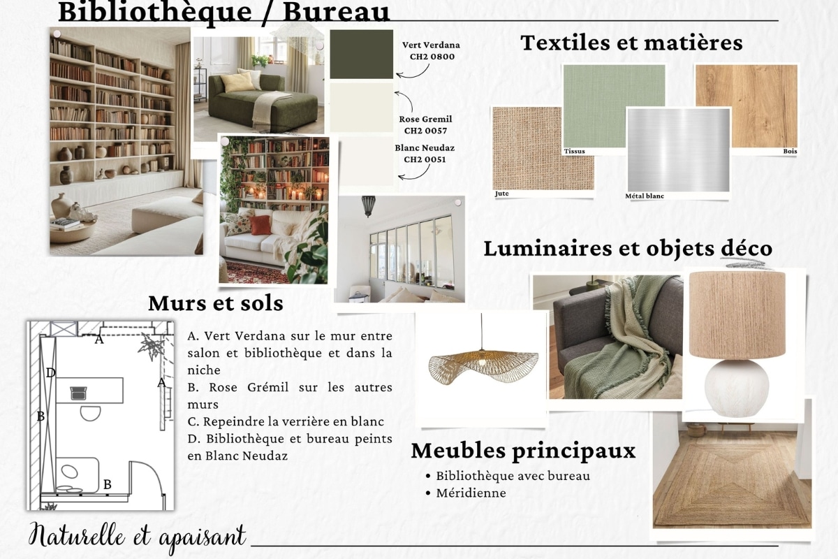 Un mur bibliothèque toute hauteur a été aménagé dans le prolongement de la pièce. Il intègre un coin lecture avec méridienne et un bureau ouvert sur le salon et le jardin, légèrement décalé pour offrir une vraie perspective vers l’extérieur.