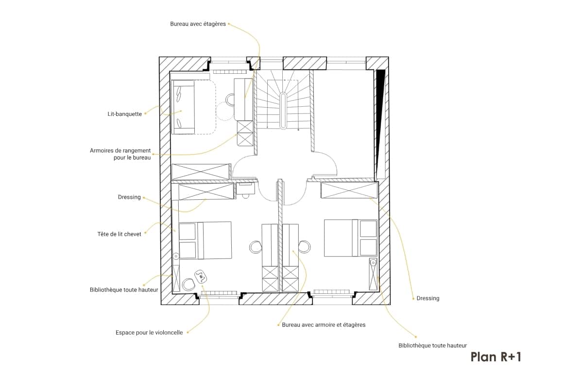 Après présentation des trois avant-projets de Vanessa, les propriétaires ont choisi une version sur mesure, issue d’un mix des différentes propositions. Un plan de maison avec 180 m² vraiment optimisé et adapté à leur quotidien, en tirant parti des volumes existants et en structurant clairement les fonctions sur les trois niveaux.