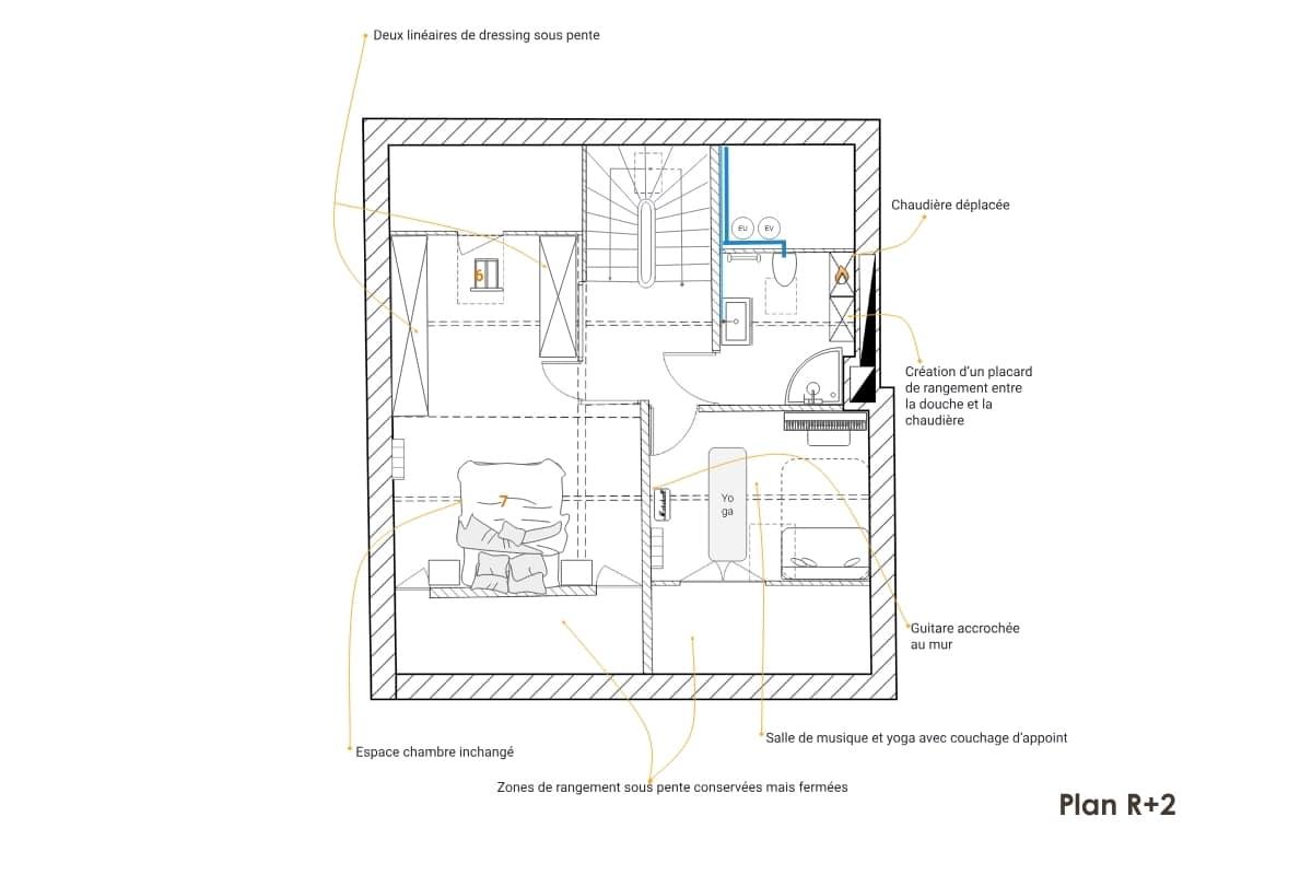 L’étage sous combles accueille désormais une suite parentale complète : dressing toute hauteur sous pente, salle d’eau sécurisée après déplacement de la chaudière, et pièce polyvalente pour la musique, le yoga ou les invités.